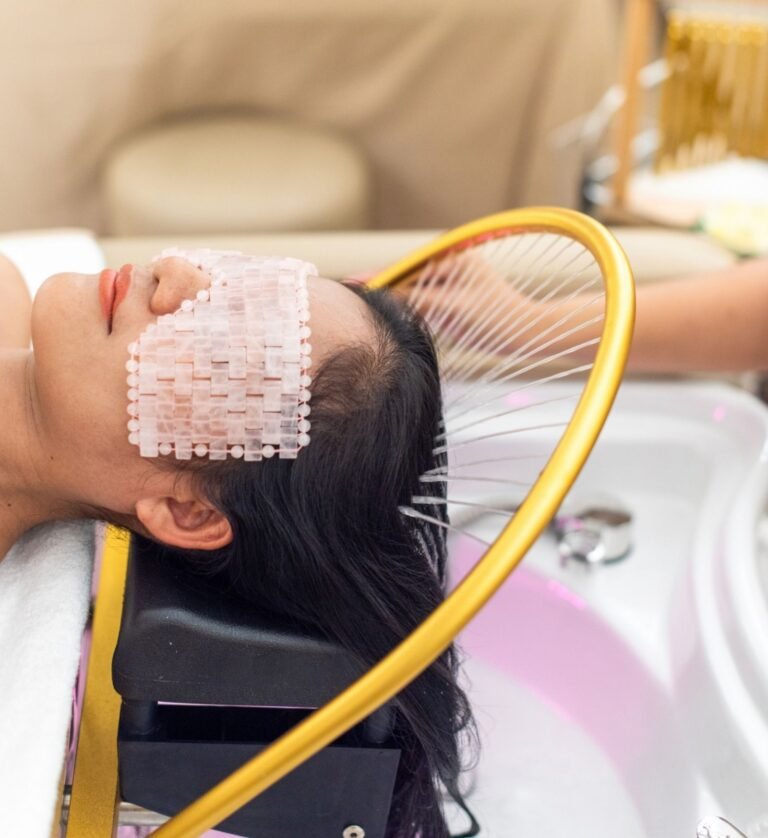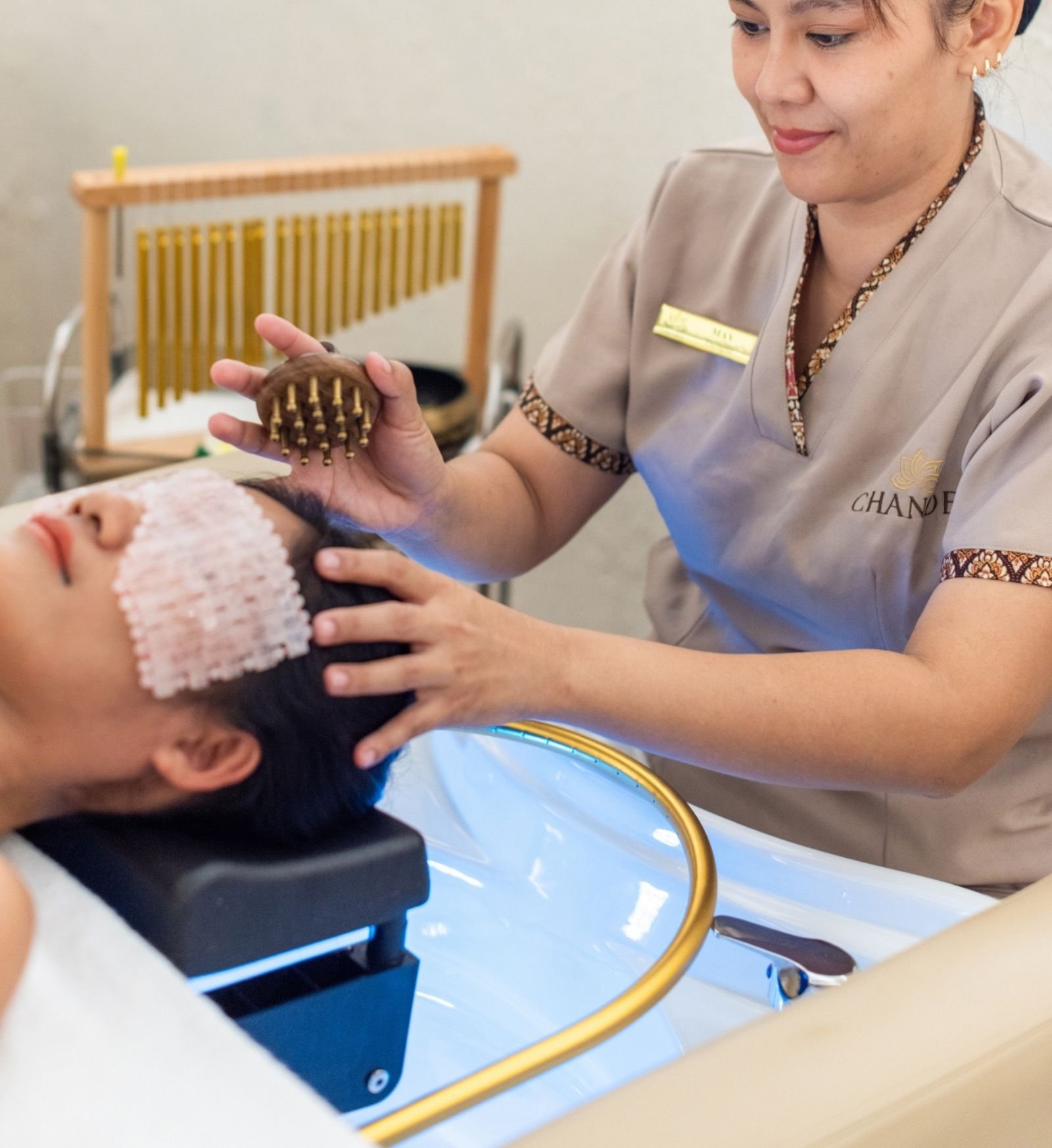 We begin with a cooling Gua Sha stone eye mask and gentle temple massage, followed by ASMR sound therapy using wind chimes and a Tibetan singing bowl. Your scalp receives deep stimulation through traditional tools including a metal head claw, sandalwood comb, and electric massager.